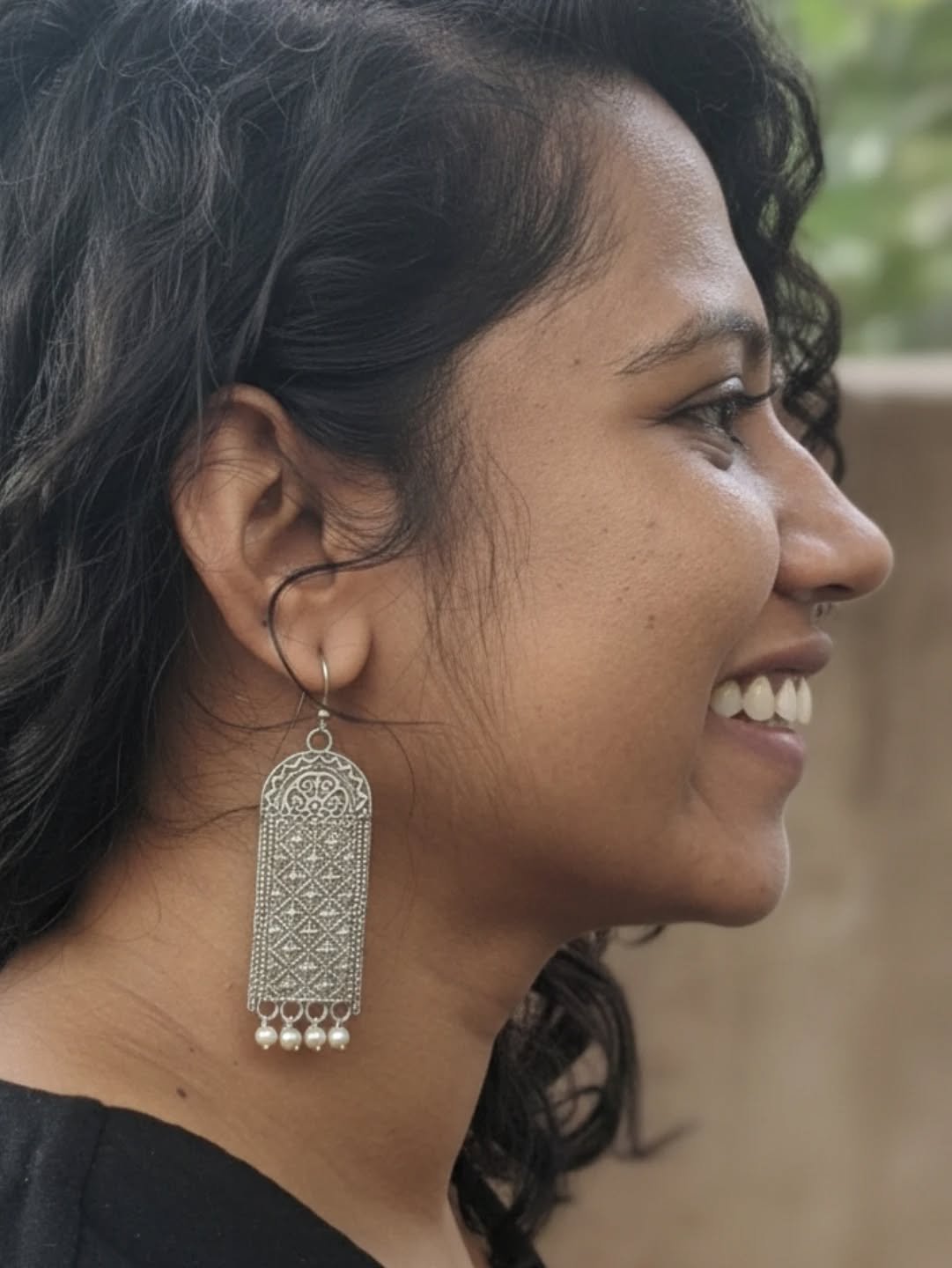Antique Silver Plated Brass Jhumka Earrings with Monalisa Stone & Pearl Drops