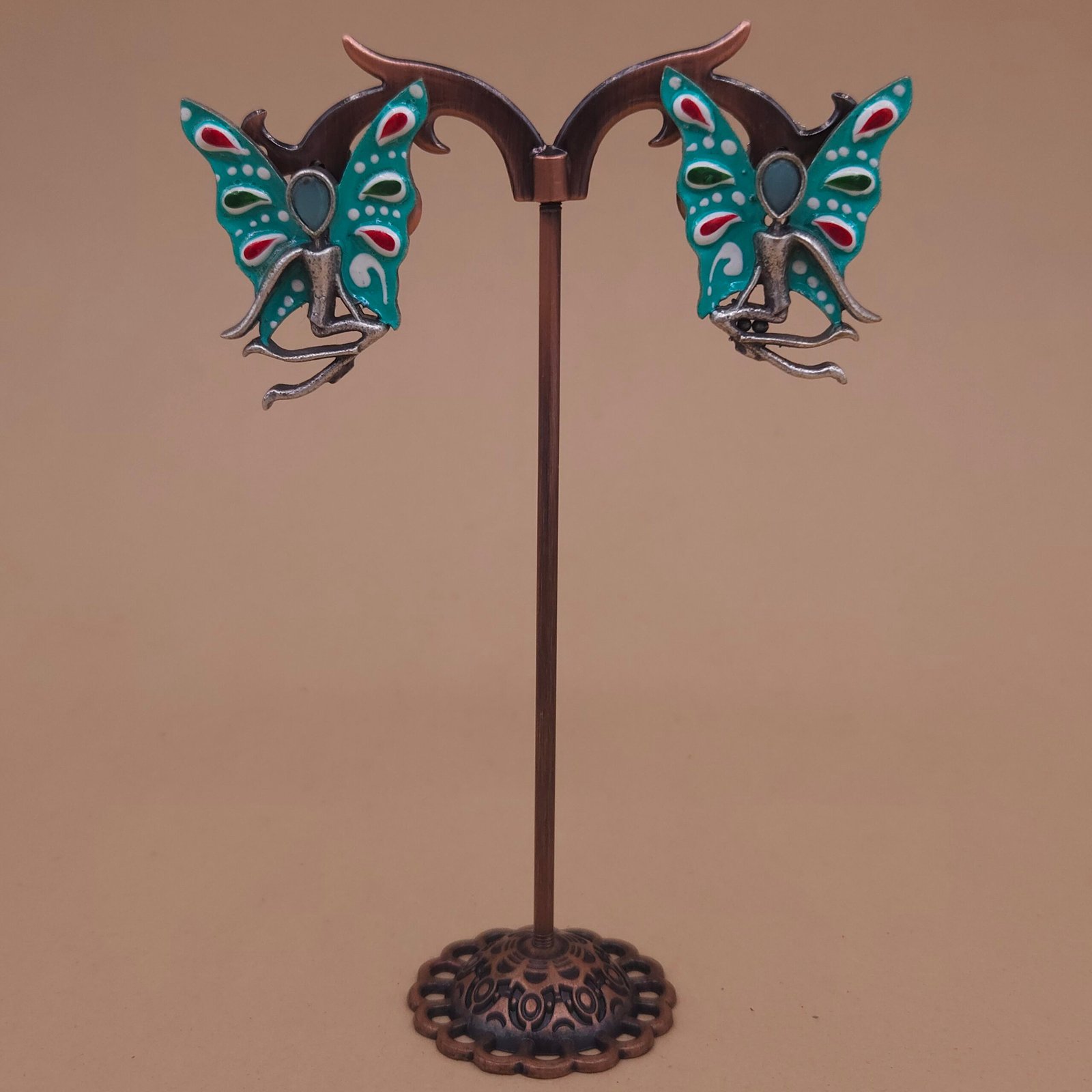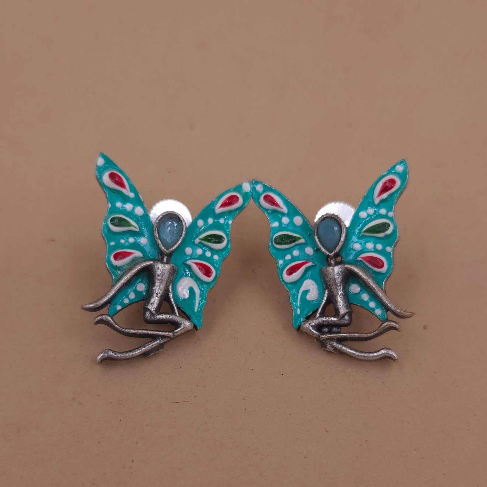 Showcase playful charm with handcrafted brass stud earrings featuring a vibrant aqua blue enamel butterfly motif detailed with red, green, and white accents. These lightweight, anti-tarnish ethnic studs offer a unique blend of creative artistry and effortless elegance, making them perfect for festive, party, or everyday wear. Intricate enamel work ensures lasting color and shine.