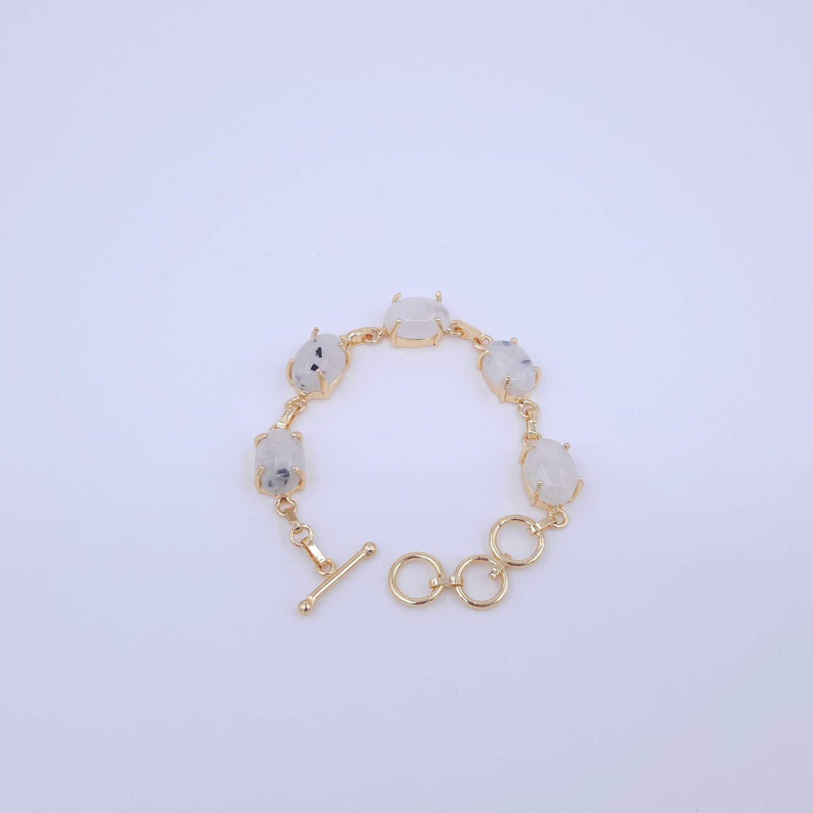 Moonstone is known as the stone of intuition, inner balance, and feminine energy, making this bracelet not only a fashion statement but also a meaningful accessory. The gold-polished brass ensures durability and shine, while the toggle clasp provides comfort and easy wear.