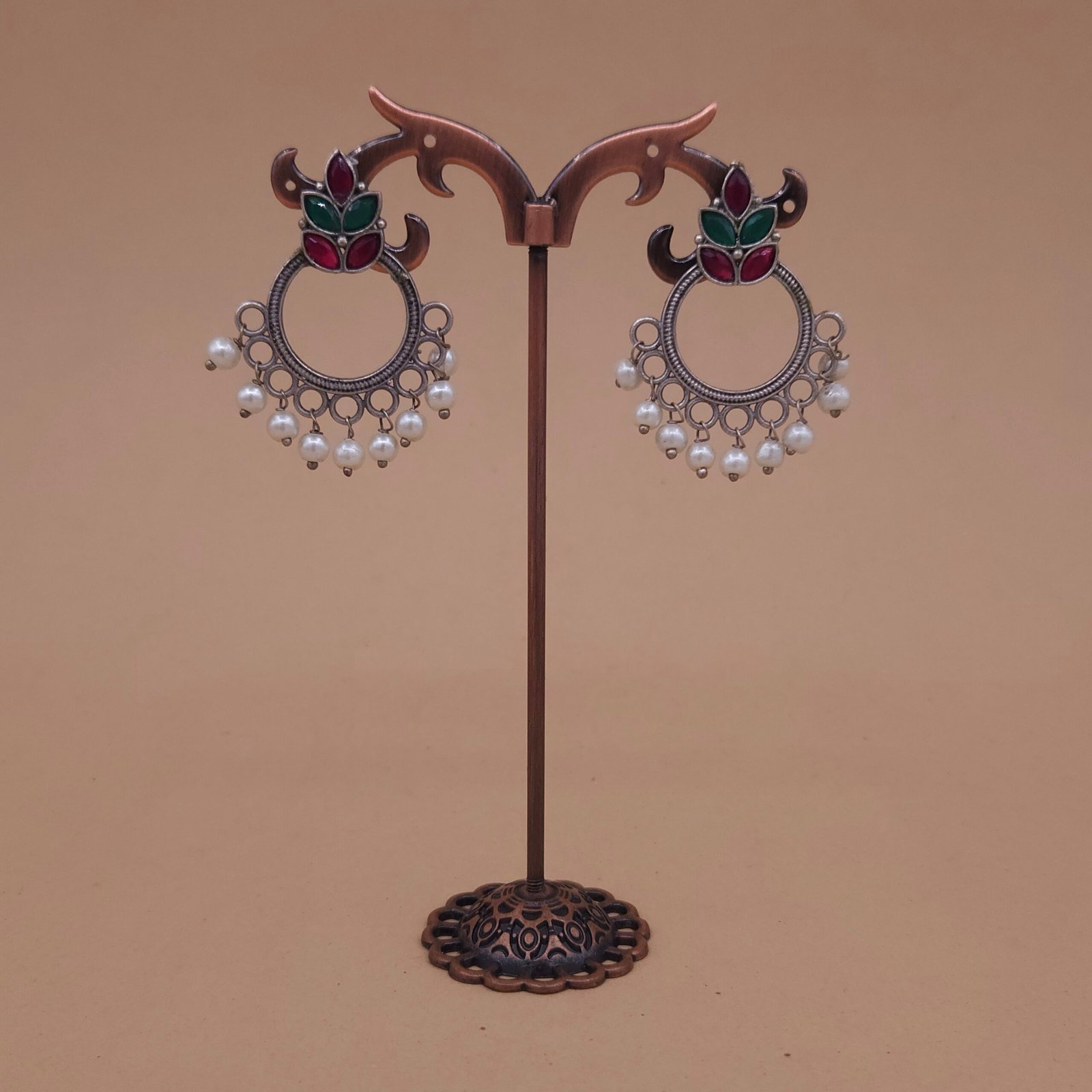 Handcrafted Green-Red Leaf Motif Silver Replica Brass Circle Earrings with Pearls – Anti-Tarnish