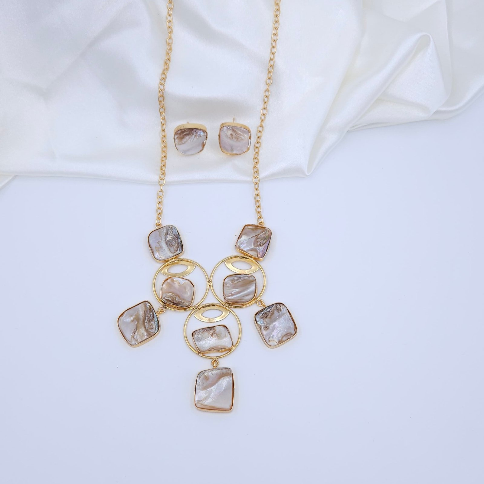 Handcrafted anti-tarnish gold necklace set with cushion-cut mother of pearl stones in a modern geometric design, plus matching stud earrings.