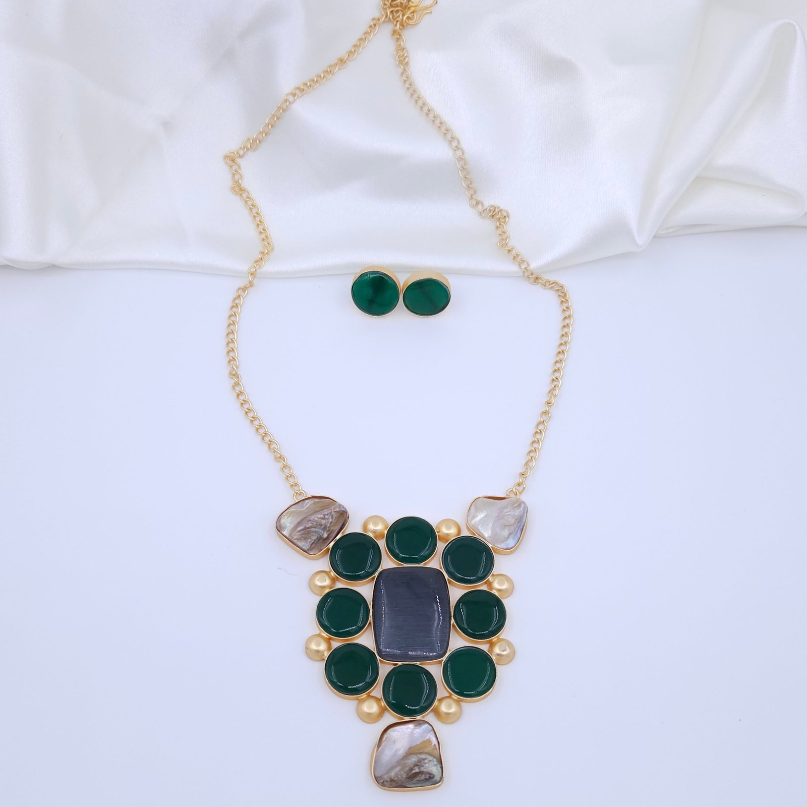 Handcrafted anti-tarnish jewellery set with mother-of-pearl and green Monalisa stones – statement gold-plated necklace and matching studs.