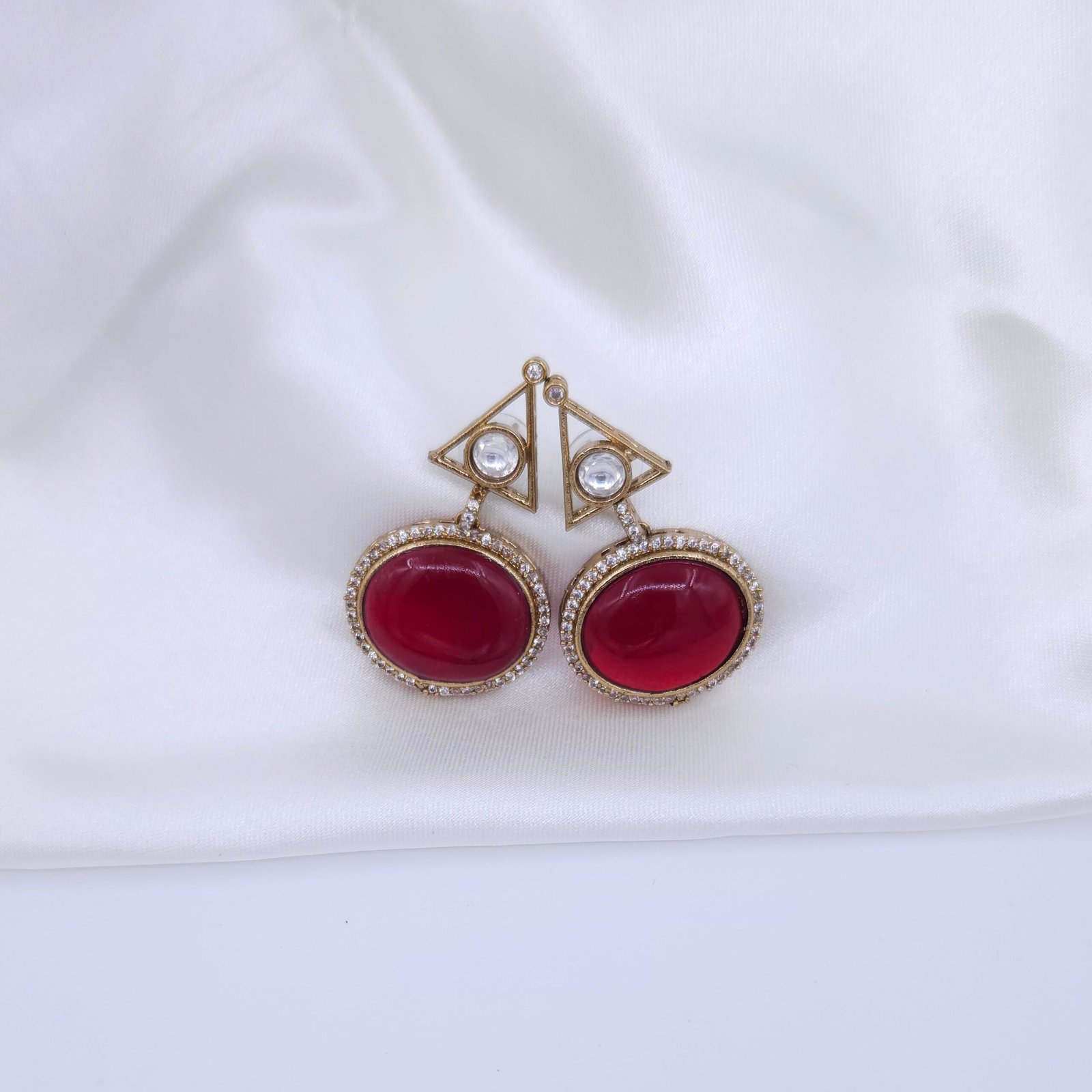 Radiate luxury and artistry with this handcrafted anti-tarnish multicolor Monalisa, moissanite, and American diamond jewelry set. The gold-plated statement necklace features vibrant cabochon Monalisa stones in black, red, peach, green, pink, and white, all encased in shimmering borders of moissanite and American diamonds. Dazzling moissanites and American diamond accents, including geometric triangle motifs, add an extra touch of brilliance and modern glamour. The matching drop earrings echo the bold red Monalisa stones with triangular moissanite and diamond details for a coordinated festive look. Hypoallergenic, anti-tarnish, and expertly handcrafted, this jewellery set is designed for weddings, parties, or standout gifting.