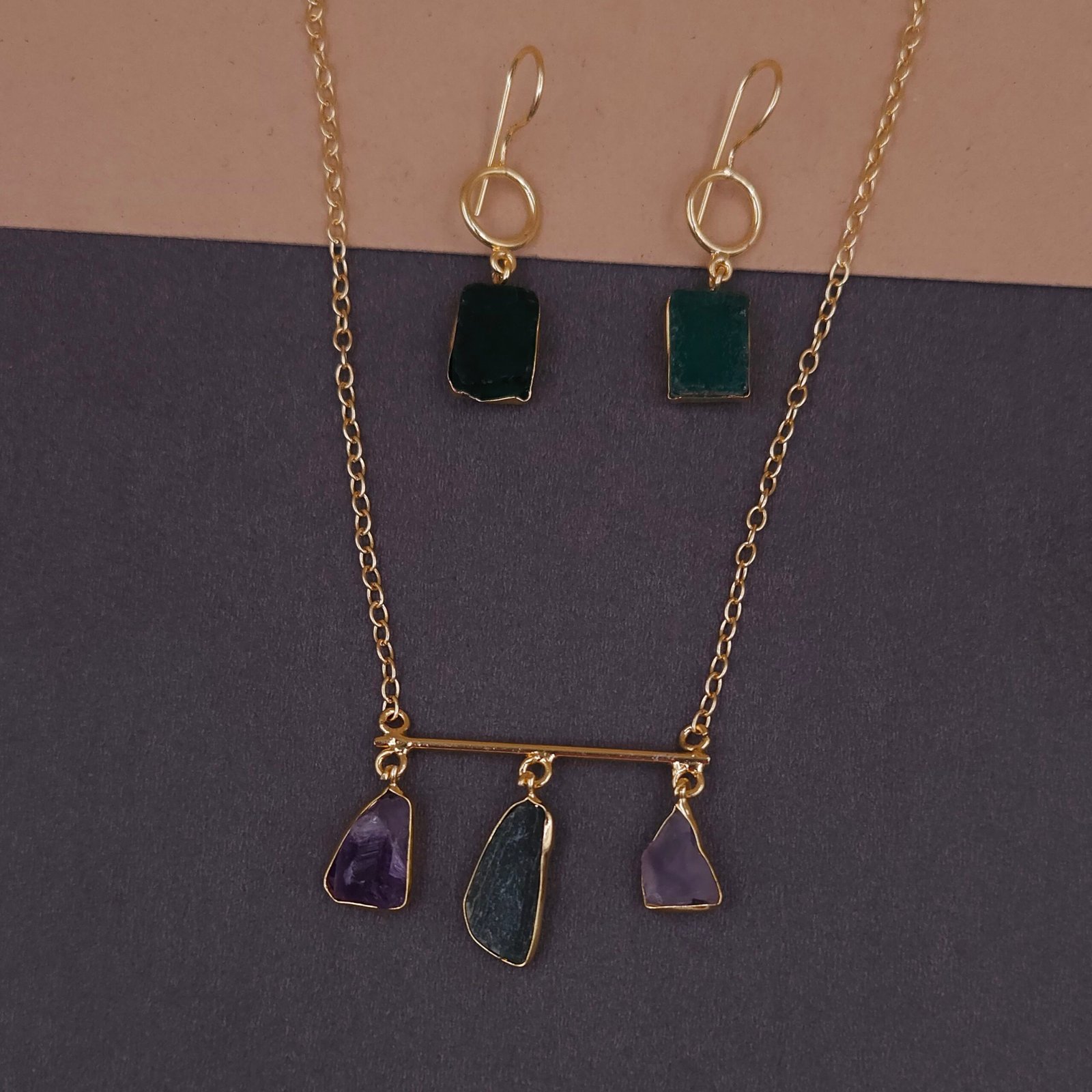 Handmade brass set with geometric bar necklace, natural stone charms, anti-tarnish gold-tone finish, and unique matching dangle earrings.