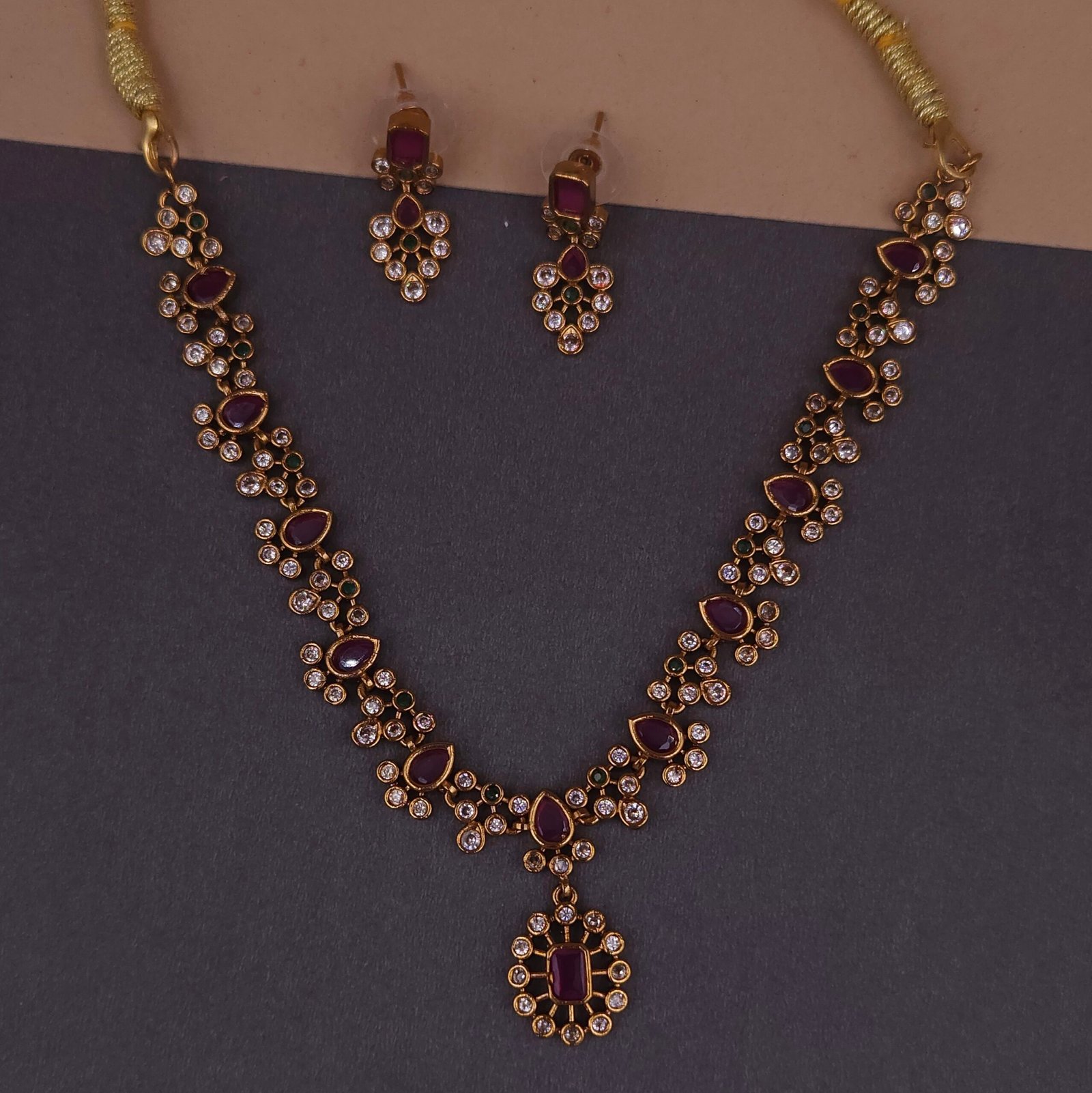 Handmade Brass Ruby Floral Motif CZ Necklace Set – Anti-Tarnish