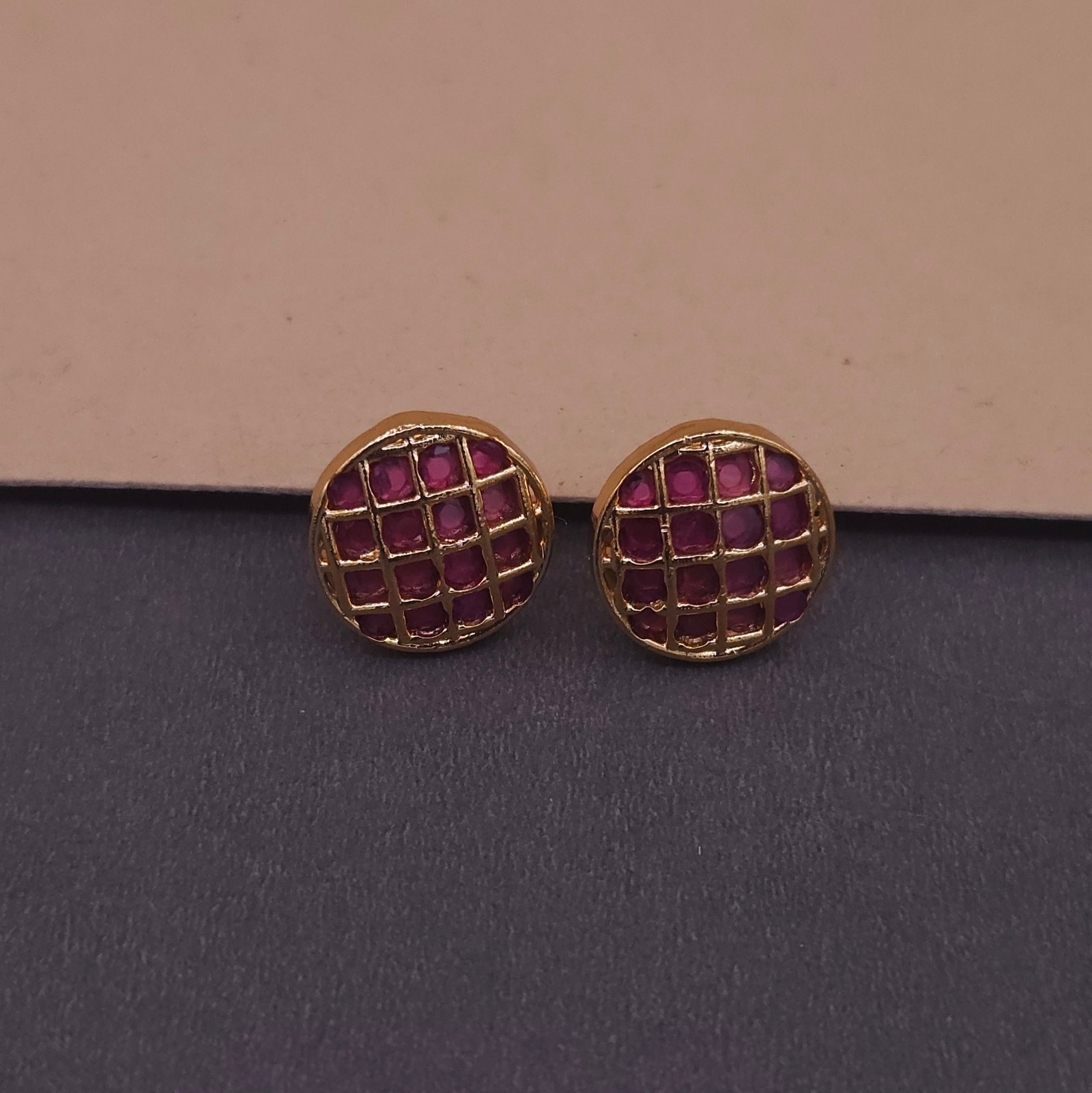 Matching round ruby lattice stud earrings complete the jewelry set for a coordinated look.
