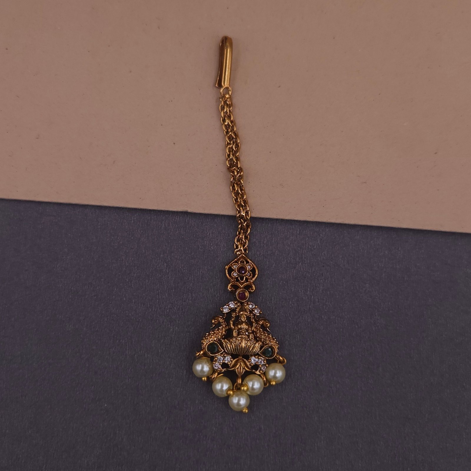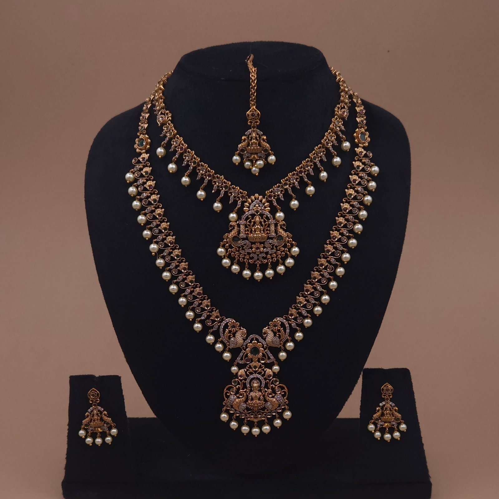 The Khianaa antique temple haram necklace set is a masterpiece of traditional design, blending divine Lakshmi motifs, peacock artistry and pearl elegance for a regal bridal statement.
