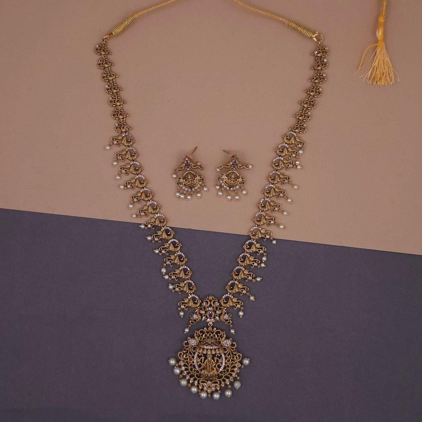 This necklace features a structured temple design with a central Lakshmi pendant, balanced by symmetrical motifs.