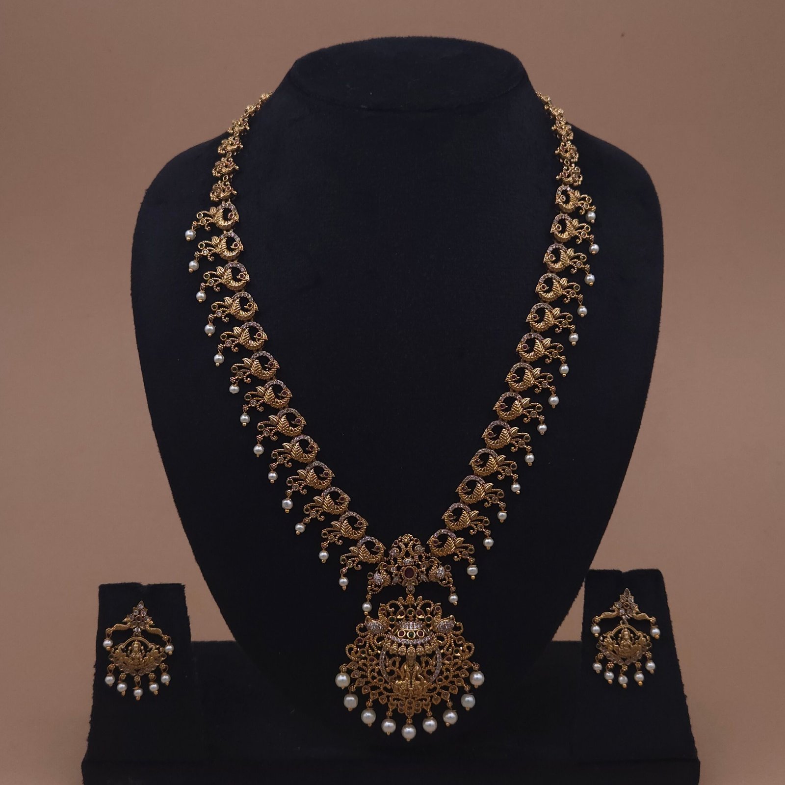 Antique Lakshmi temple necklace set with peacock motifs, zircon stones and pearl drops. Elegant statement jewelry perfect for festive and traditional occasions with matching earrings.