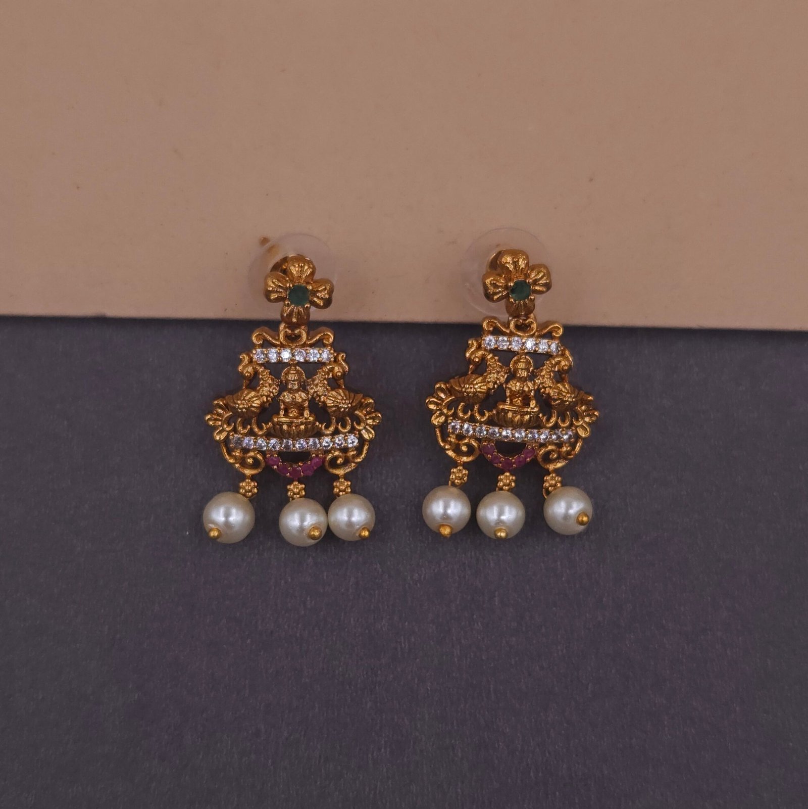 Sparkling zircon stones enhance the intricate metalwork, while elegant pearl drops add graceful movement and traditional charm.