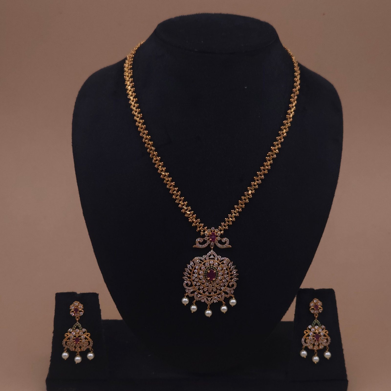 The necklace features a royal circular pendant adorned with kemp stones and sparkling zircon crystals, creating a radiant centerpiece. Pearl drops gracefully hang from the pendant, adding movement and elegance.
