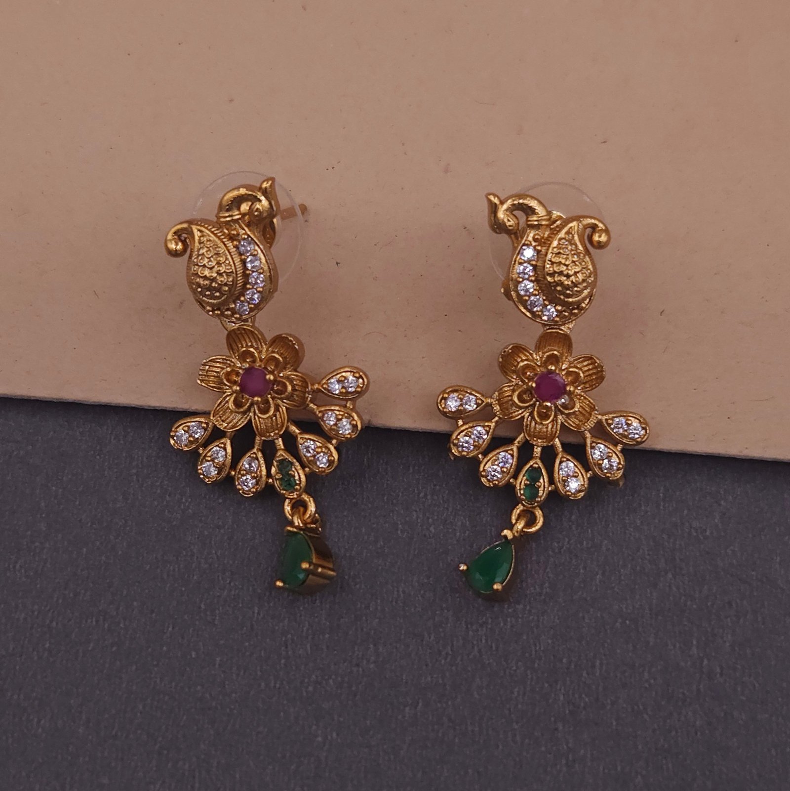 Matching earrings feature peacock and floral motifs with green stone drops, completing the coordinated traditional look.