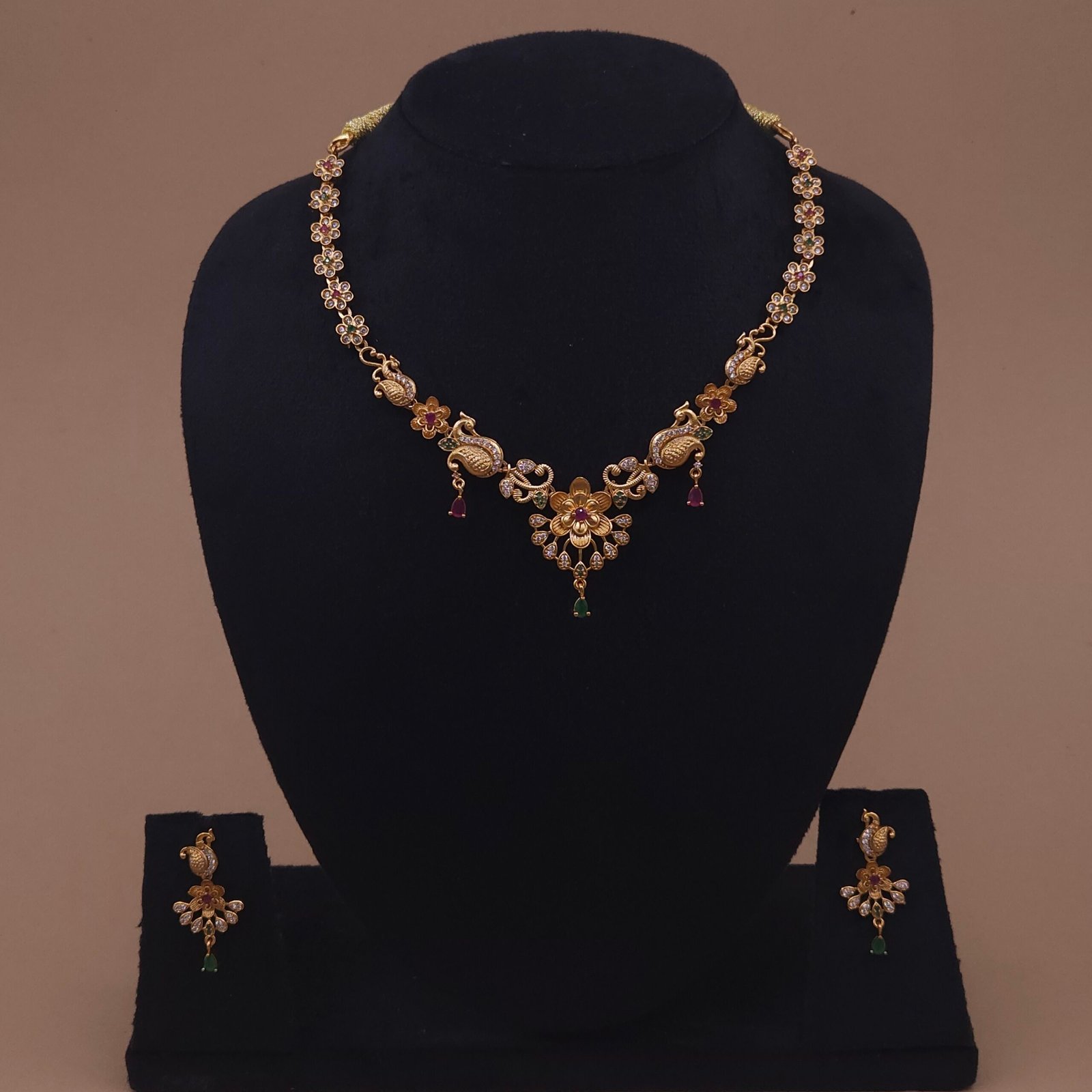 The necklace showcases intricate peacock motifs combined with floral temple patterns, highlighted with ruby stones, green accents and sparkling cubic zirconia. The centerpiece pendant features a blooming floral design with delicate stone arrangement, creating a rich and elegant visual balance.