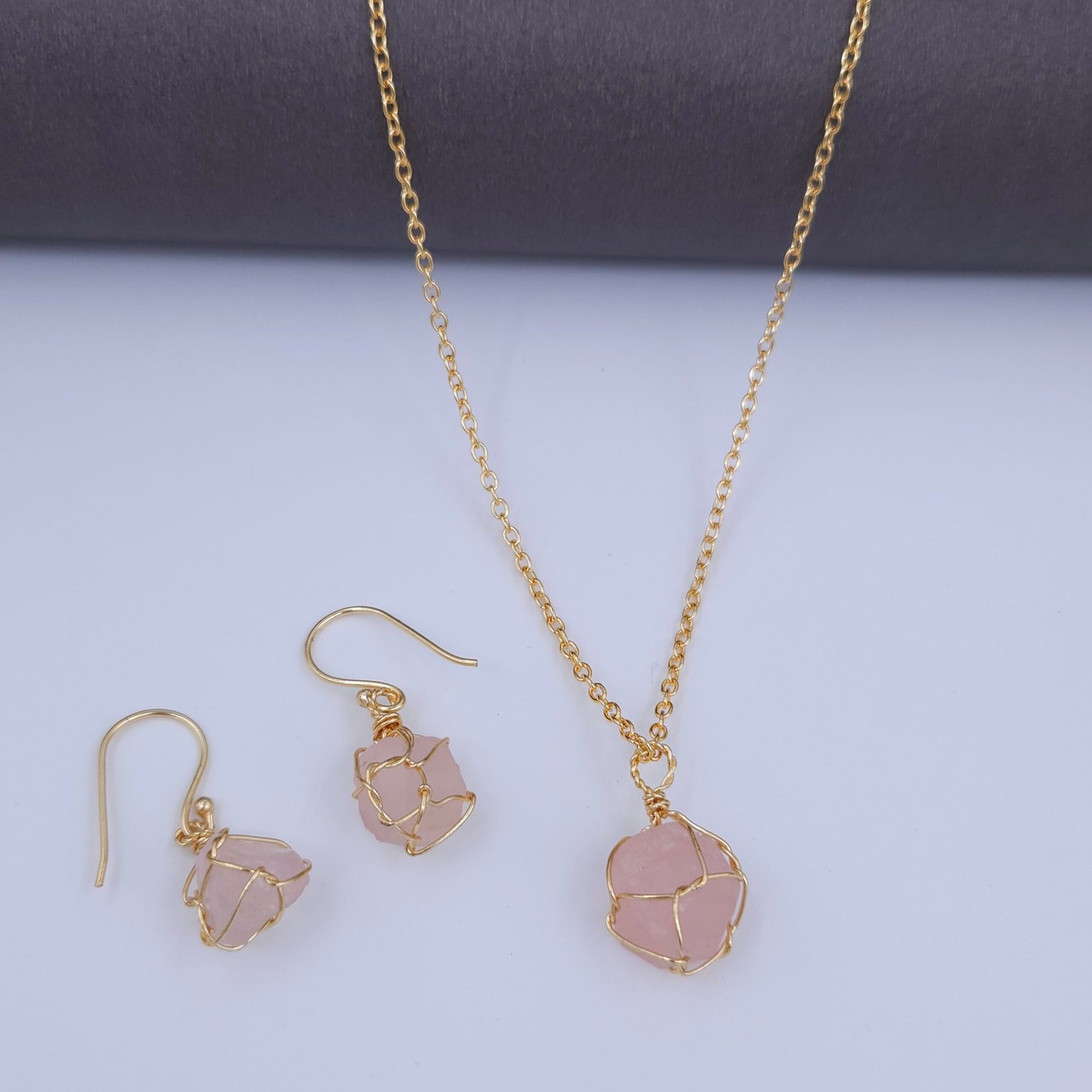 Handcrafted gold-plated jewelry set featuring blushing pink natural stones with elegant wire-wrapping for a gorgeous, feminine style.