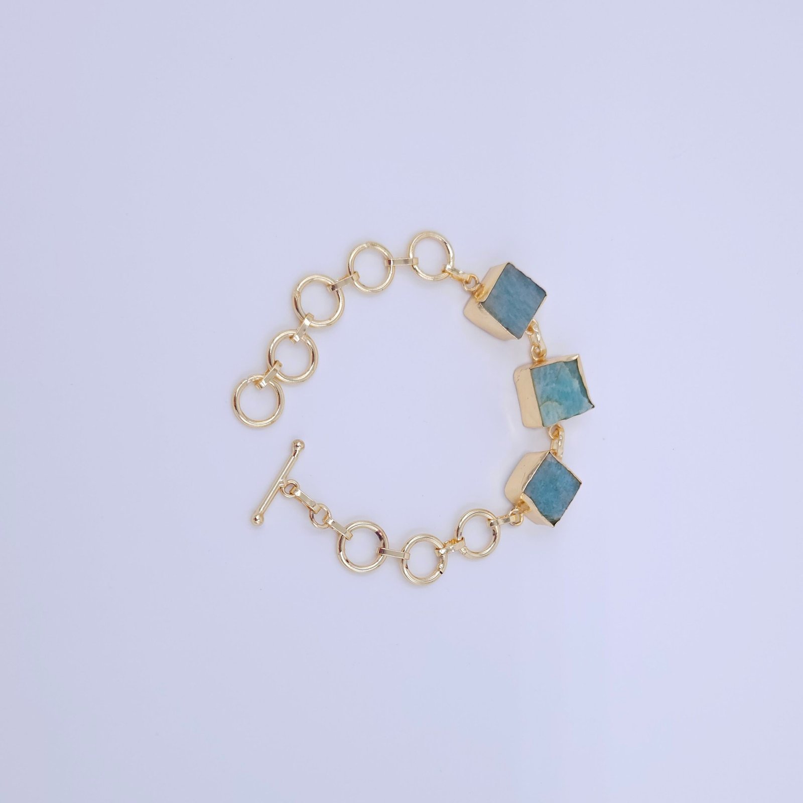 Handmade brass bracelet with gold-plated link chain and bold square aqua stones. Modern, geometric, and anti-tarnish – perfect for women’s daily wear or gifting.