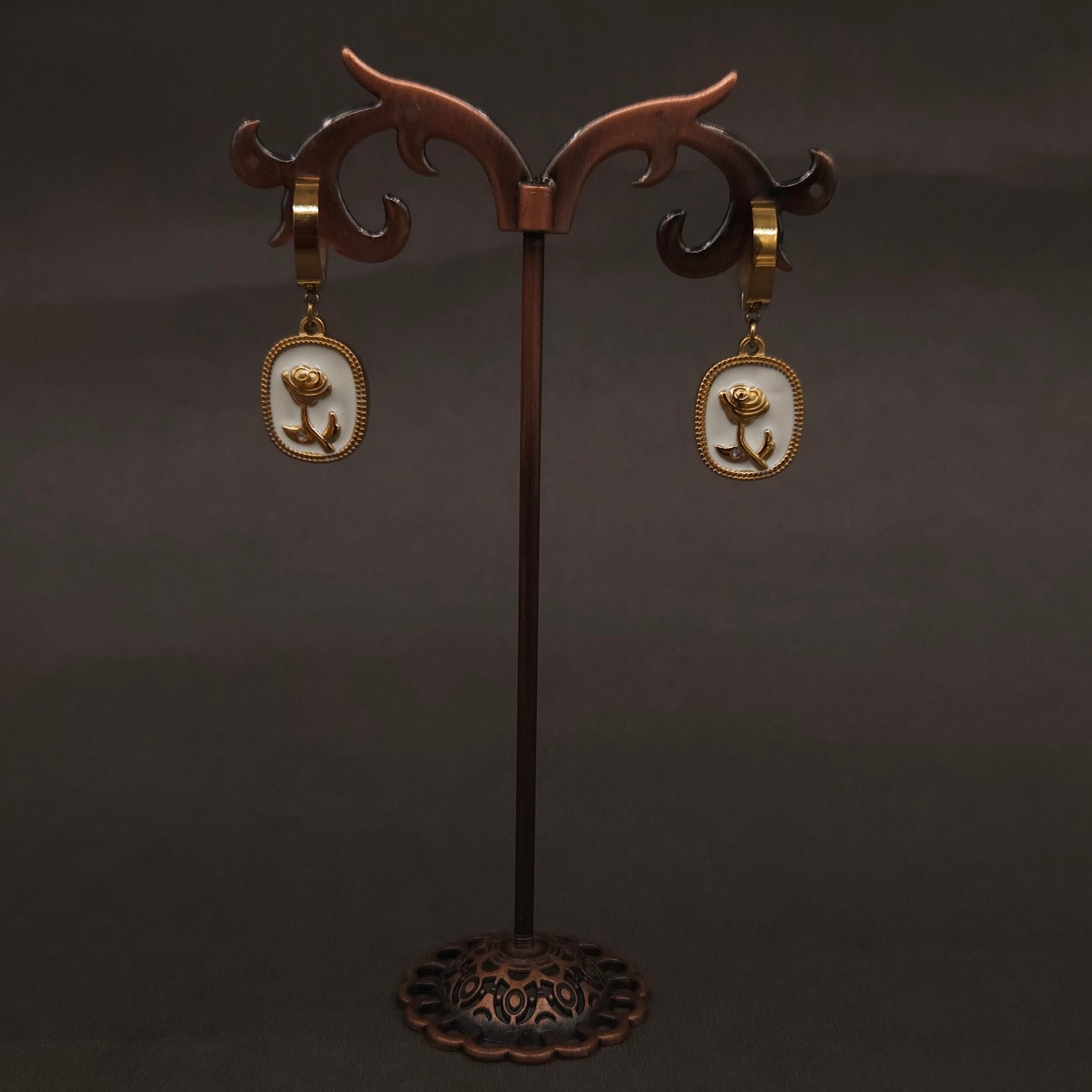 Anti-tarnish stainless steel hoops with vintage-inspired gold cameo rose drops on white enamel. Elegant, modern, and durable statement jewelry.