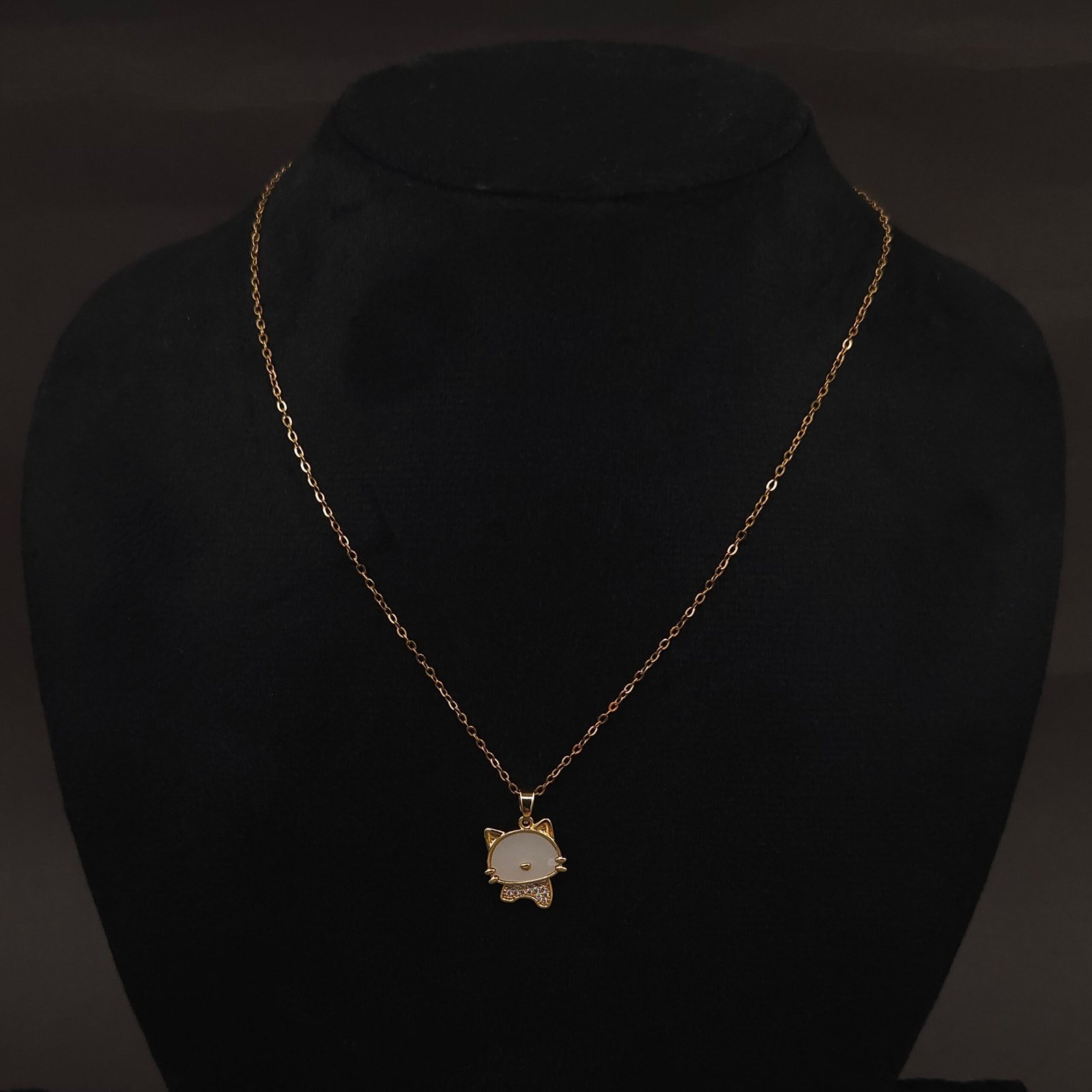 Chic cat face pendant necklace in anti-tarnish stainless steel, featuring a white stone face and sparkling CZ-studded bow for playful, elegant style.