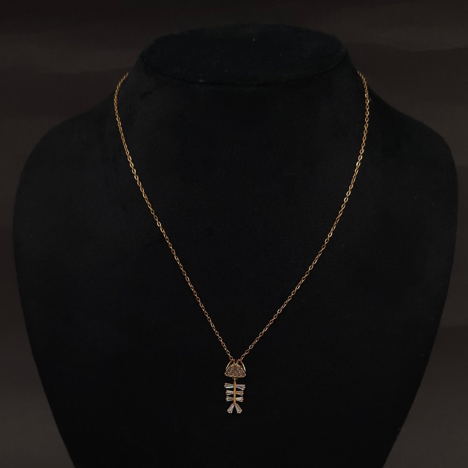 Anti-tarnish gold stainless steel necklace with a crystal-embellished fishbone pendant. Playful, modern accessory ideal for gifting and layering.