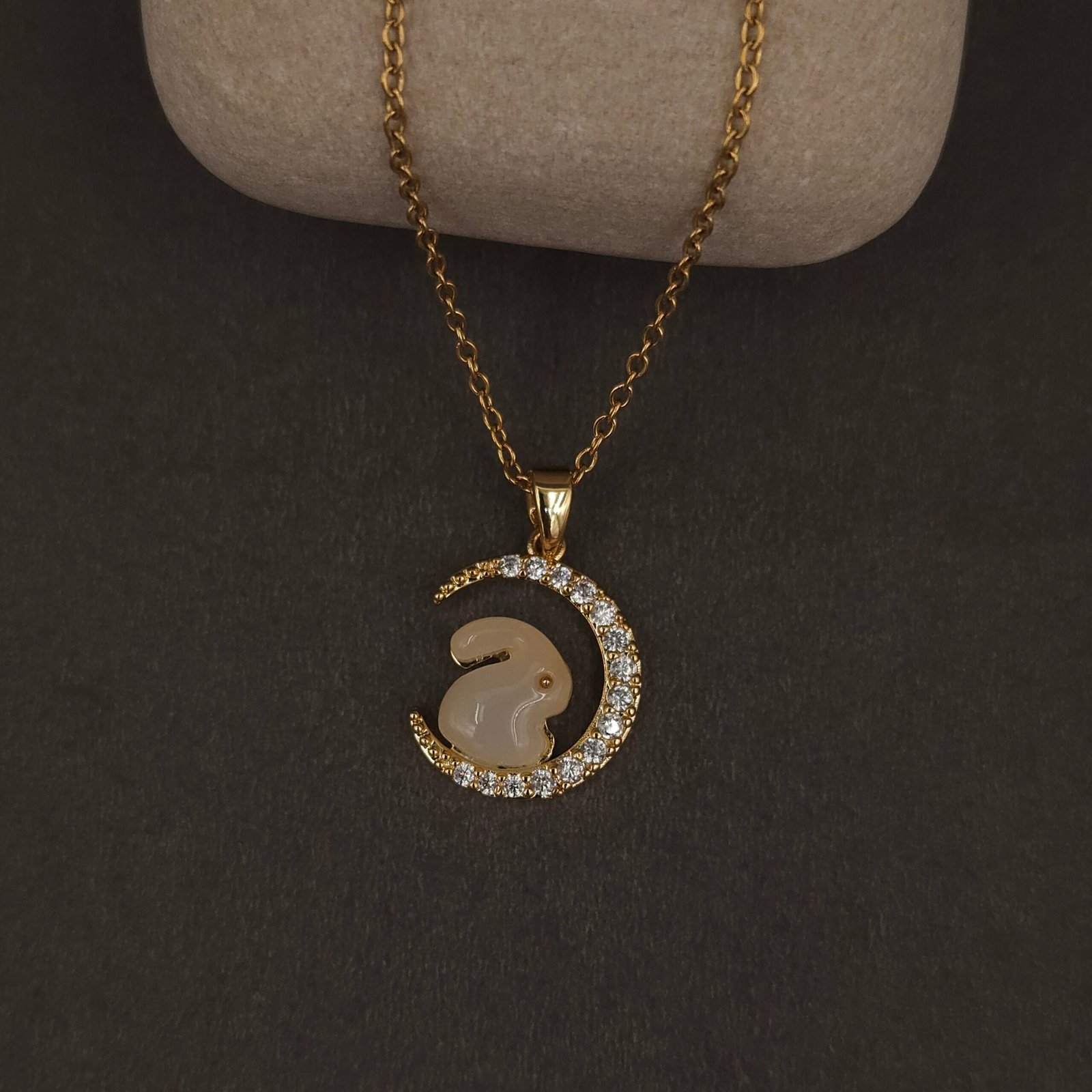 Charming gold bunny in crescent moon pendant necklace, crafted from anti-tarnish stainless steel with sparkling CZ accents for modern playful elegance.