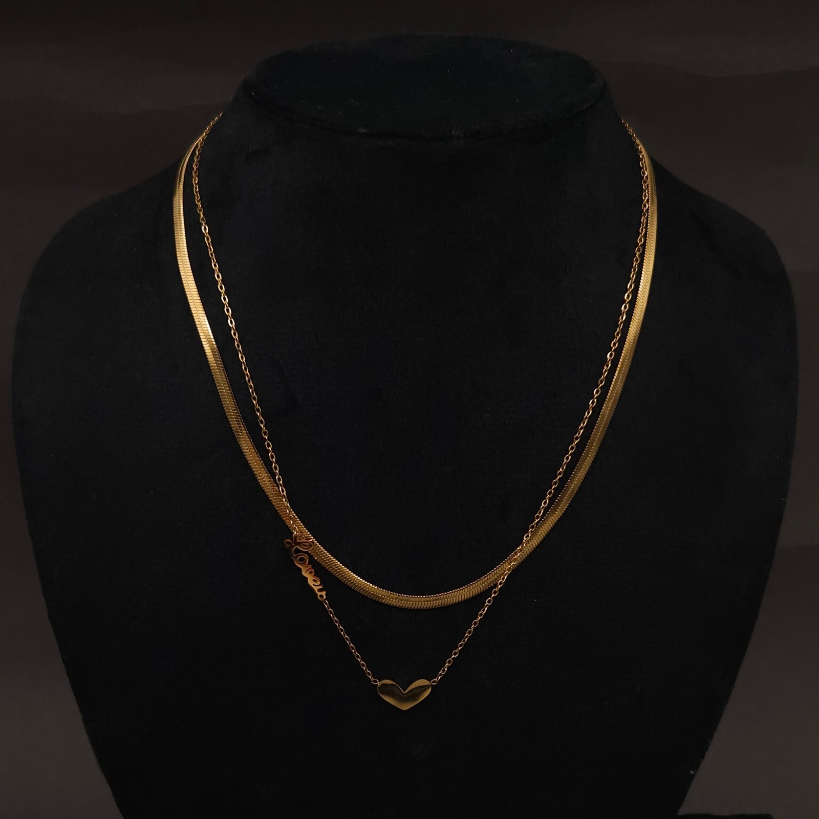 Layered stainless steel necklace with anti-tarnish finish, gold heart pendant, and script “love” motif. Fashionable modern jewelry for all occasions.