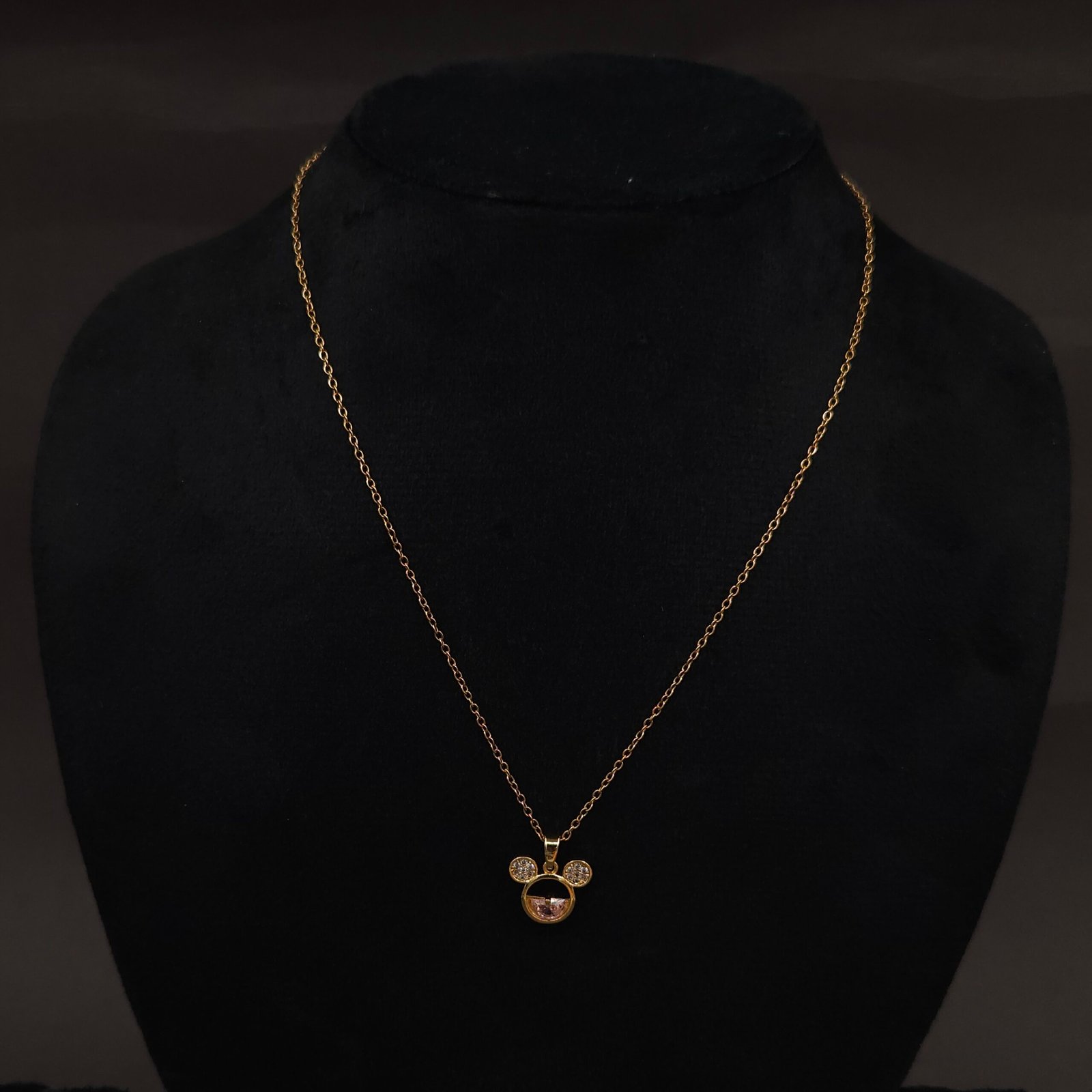 This cute mouse charm pendant necklace is crafted from hypoallergenic stainless steel and finished with anti-tarnish gold plating. Featuring a playful mouse silhouette, the design showcases sparkling cubic zirconia on both ears and a pink stone accent that adds a touch of whimsy. Durable, lightweight, and comfortable, it is perfect for gifting or trendy everyday looks.