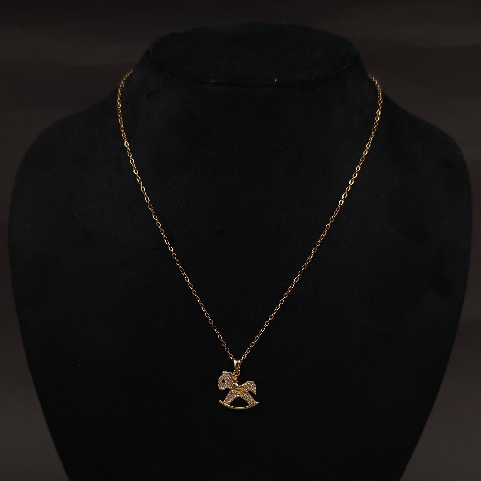 Whimsical rocking horse pendant necklace in anti-tarnish stainless steel, glittering with CZ accents for playful, elegant everyday style.