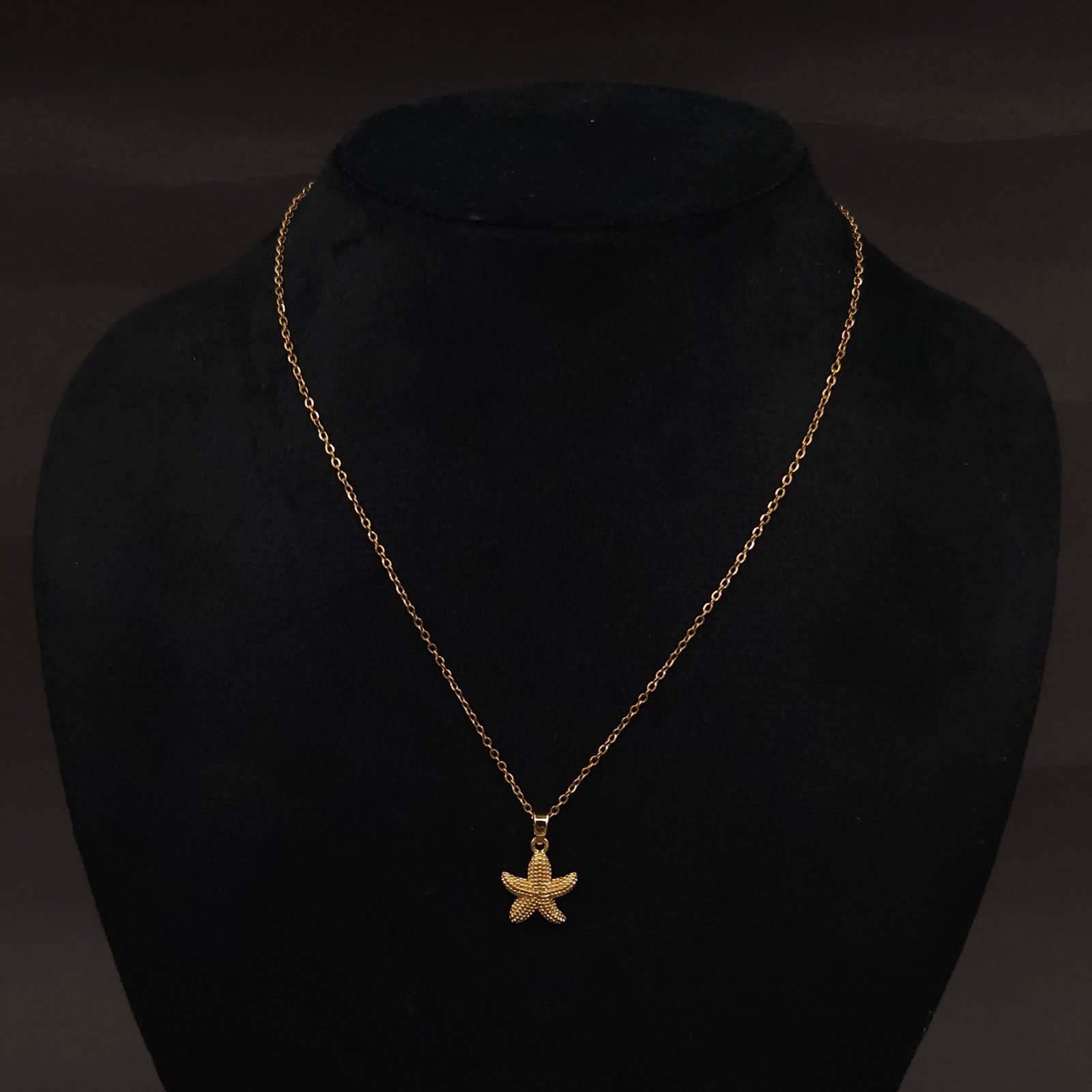 Anti-tarnish gold stainless steel necklace with a textured starfish pendant. Ocean-inspired style for gifting, layering, or summer accessorizing.