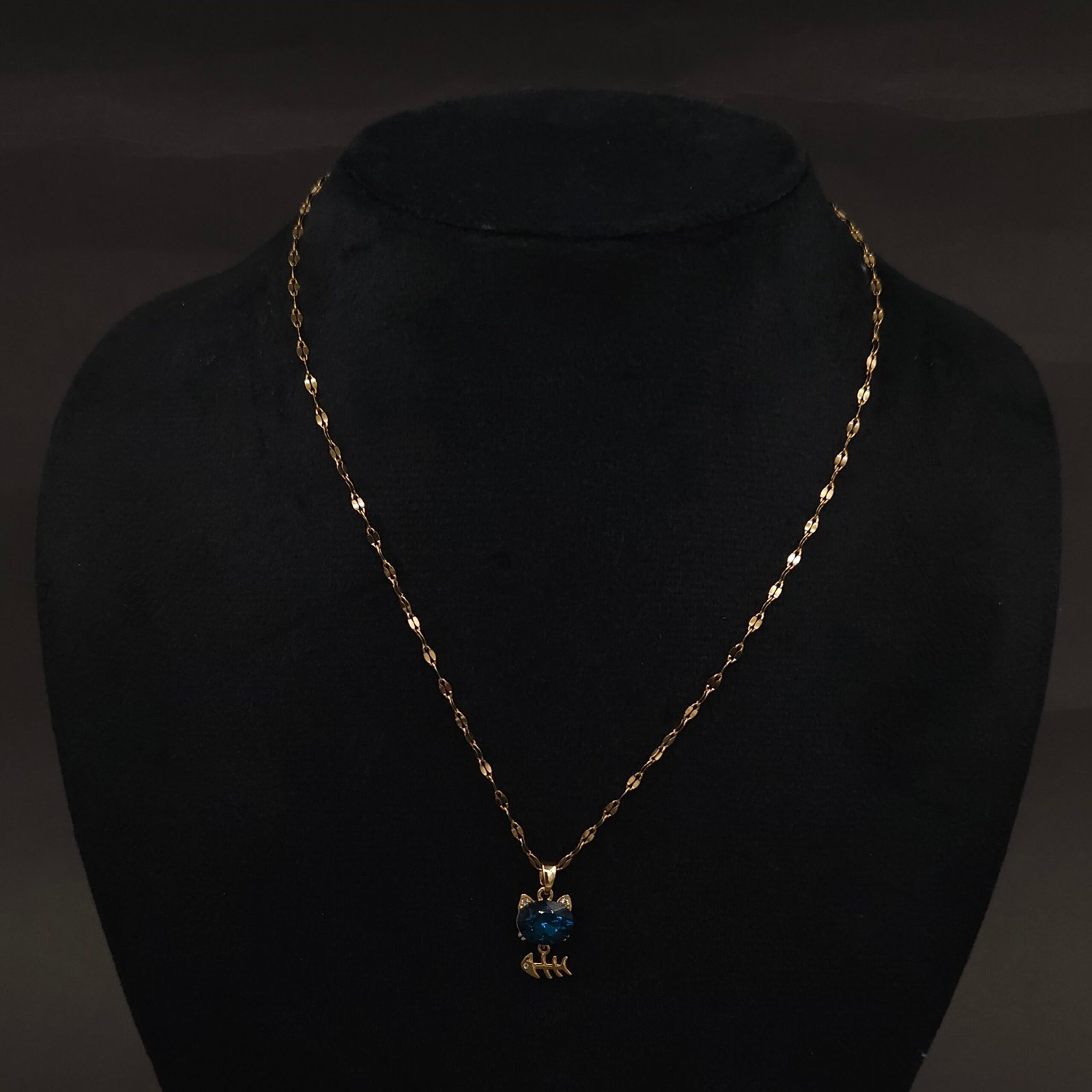 Anti-tarnish gold stainless steel necklace with cat and fishbone pendant, featuring a sparkling blue gemstone. Cute, unique, and perfect for gifting.