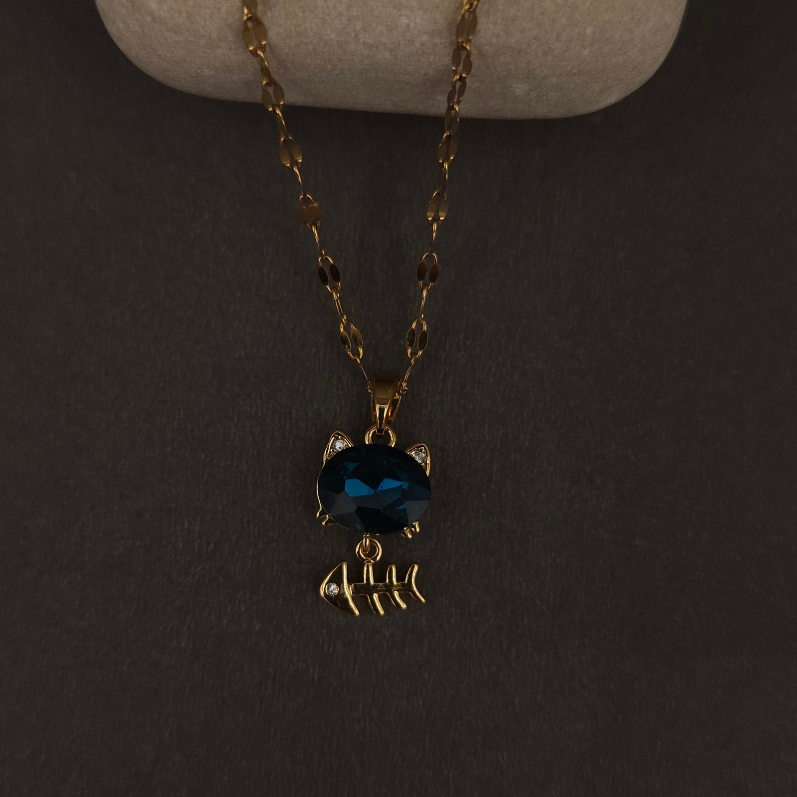 Stainless Steel Cat & Fishbone Blue Gemstone Pendant Necklace – Anti-Tarnish